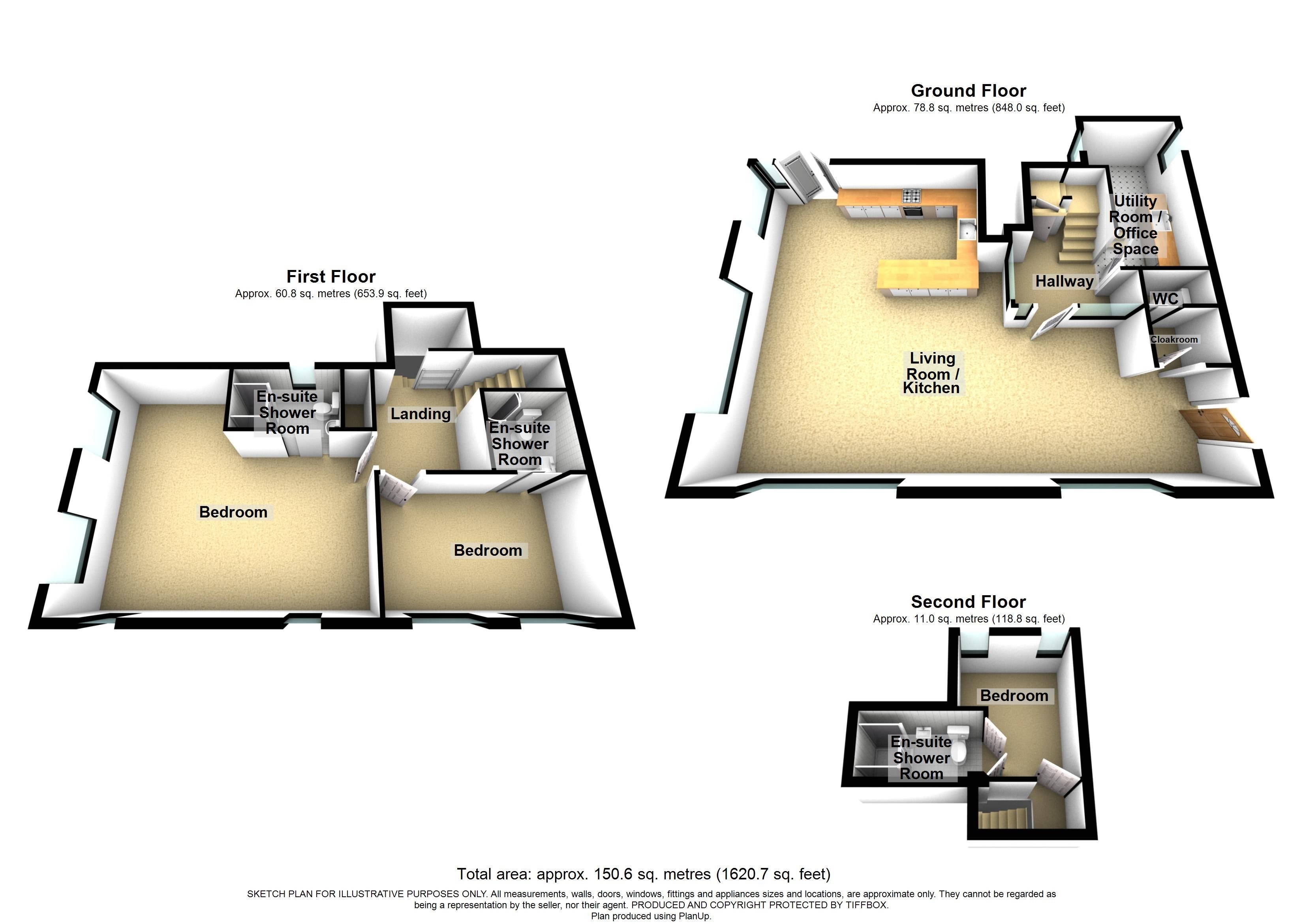 This exceptional three-bedroom split level apartment over 2 floors, comprises: Entrance via a communal reception hall featuring solid oak herringbone flooring and a unique stained-glass window. Entrance into the apartment with cloakroom/WC, an impressive open-plan living and dining area, and a contemporary kitchen fitted with new units and integrated appliances. An oak staircase leads to the mezzanine floor, which includes a utility room and offer's space for a study area. On the first floor, the master bedroom boasts outstanding views and an en-suite shower room, while the second bedroom also benefits from its own en-suite. A further staircase leads to the second floor, where you’ll find a third bedroom with an additional en-suite shower room.